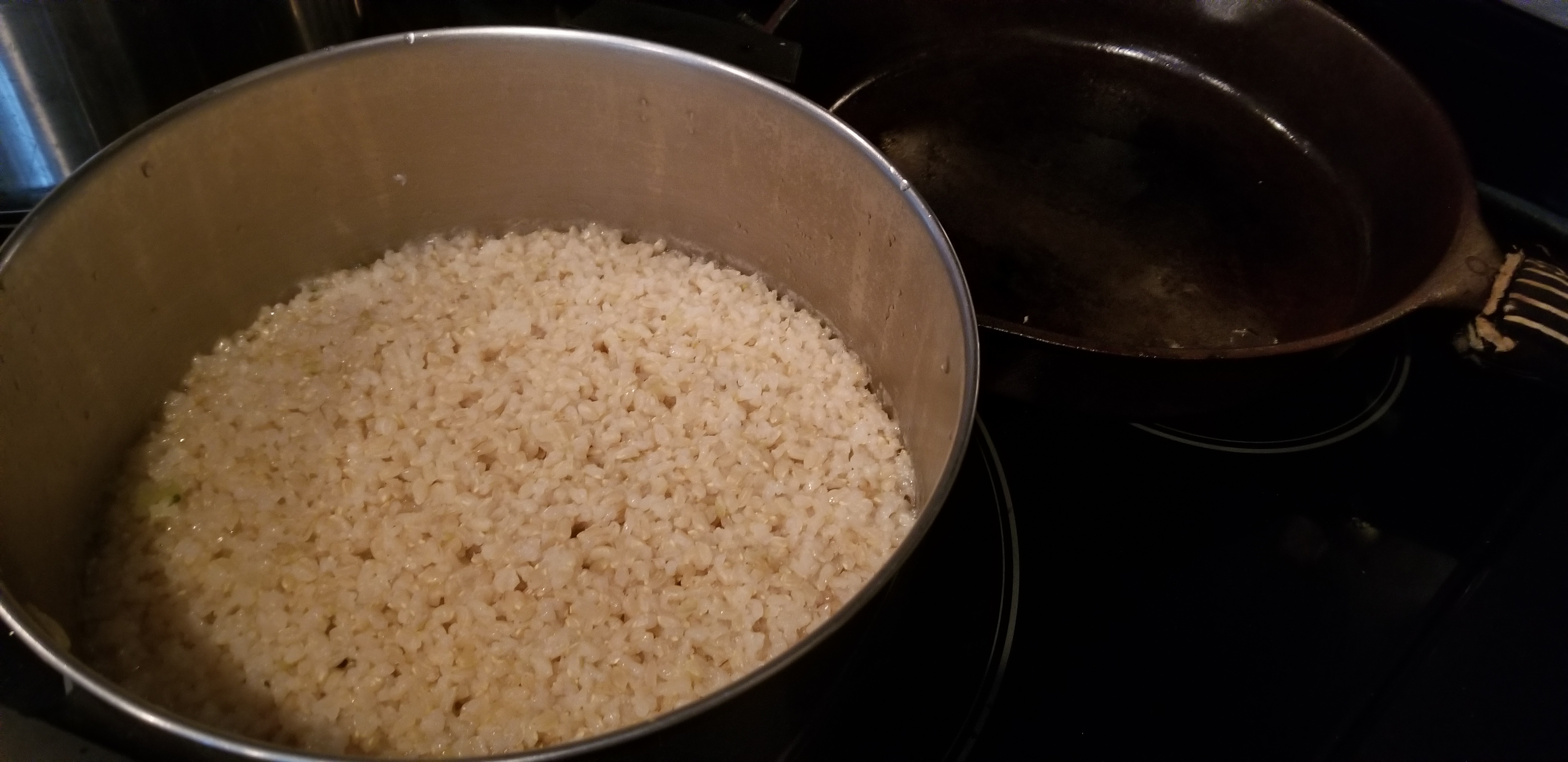 Salt, oil, 2 cups brown rice, a pinch of cardamom seeds (didn't have the pods on hand). This BB involved an electric stove top to go with a curry dish.