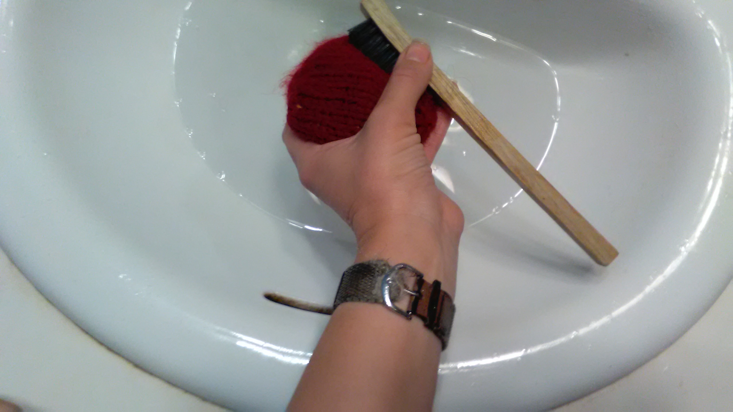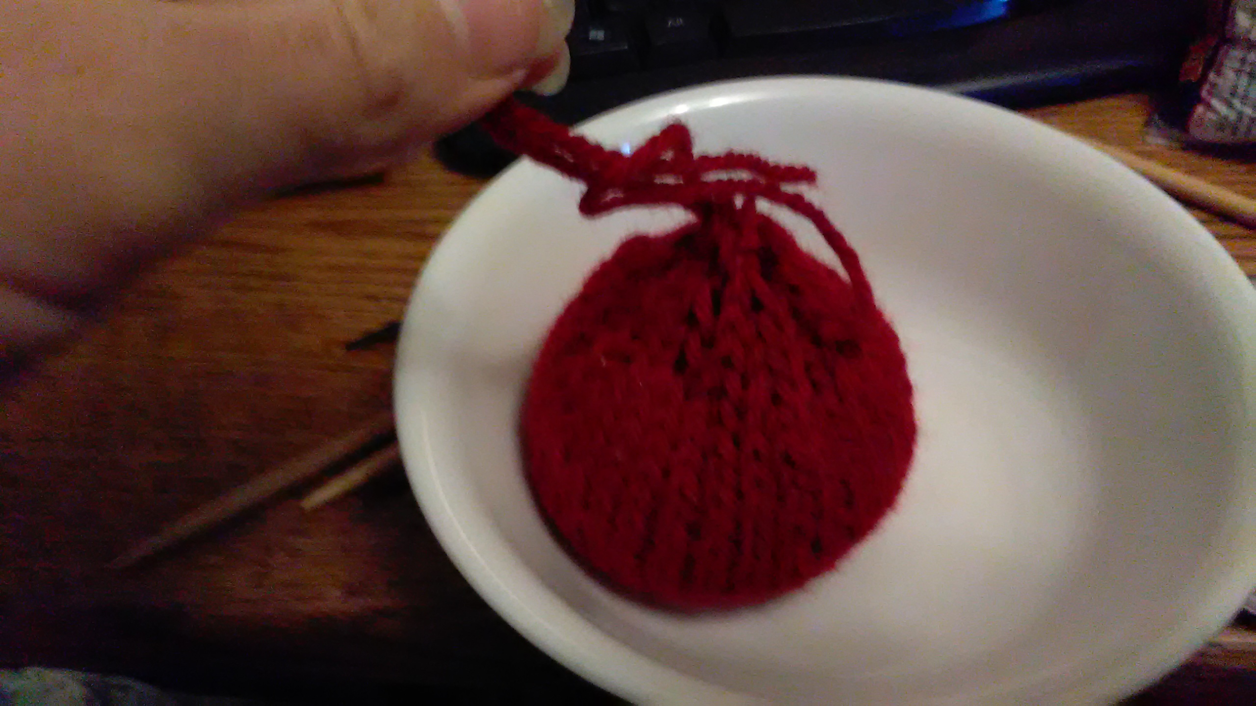 • Time out. Turn the bag inside out and weave in the inside end a little, or if the original end is on the outside, weave it to the inside and use it to close up any gapping that may have occurred due to the kfb’s.